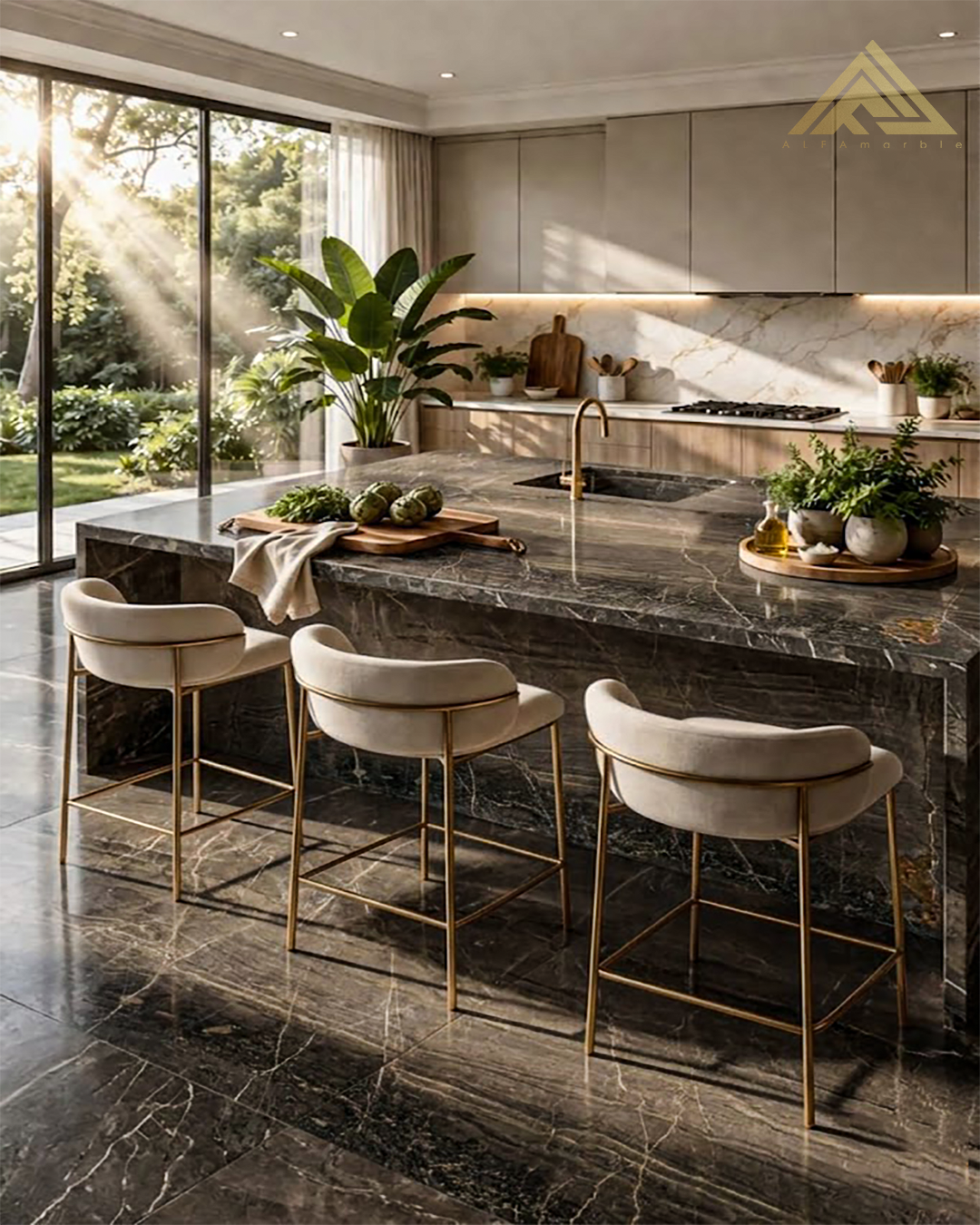 يتمتع بعروق ذهبية تتوزع بعشوائية على الأطراف، لتكسر الجمود اللوني وتضفي حيوية ودفئاً طبيعياً.